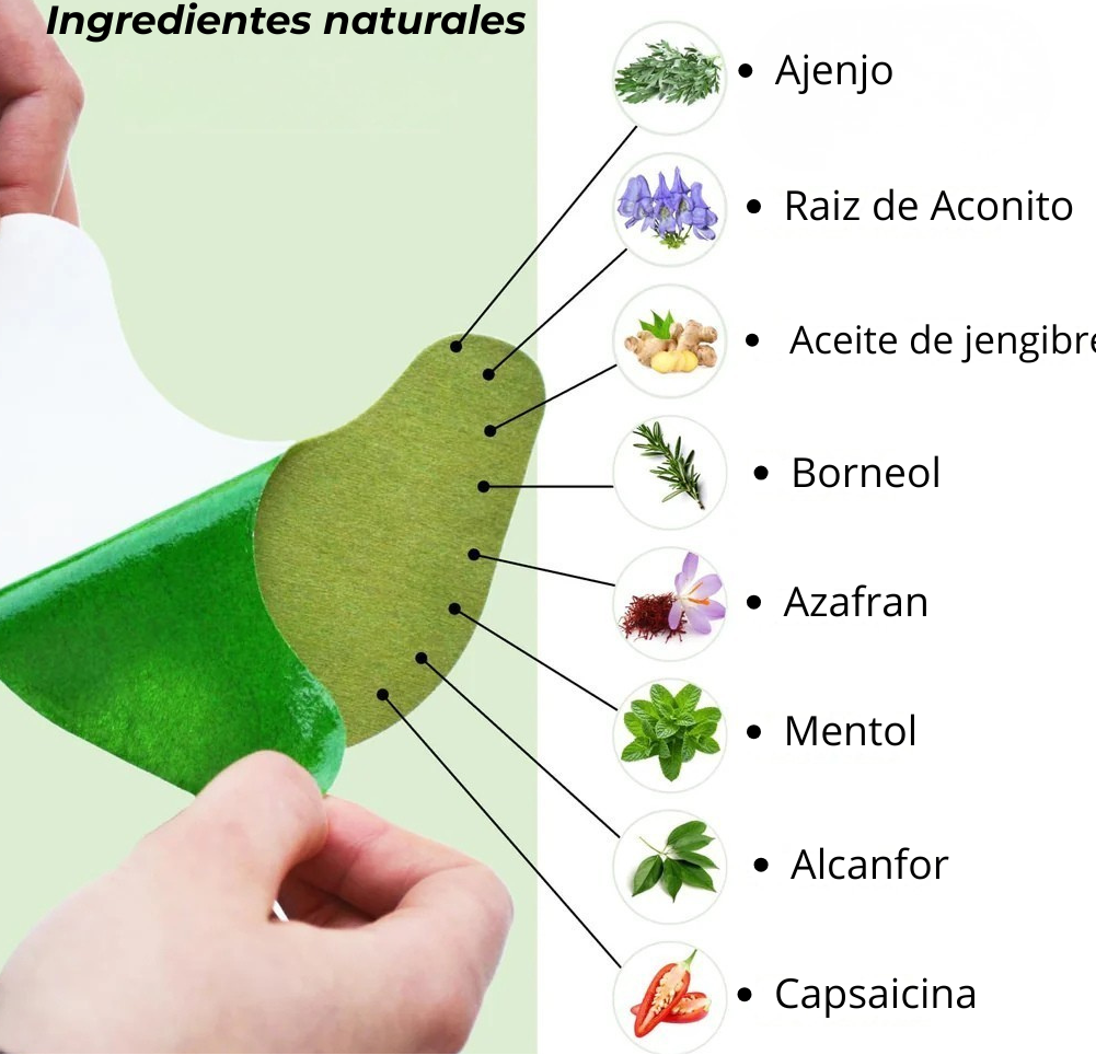 Nuestros parches liberan extractos de plantas como arnica, jengibre, menta y curcuma, que ayudan a relajar los músculos, mejorar la circulacion y reducir la inflamacion.